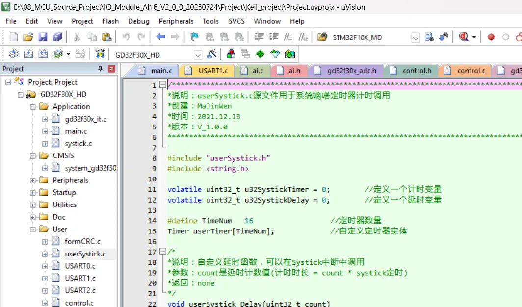 .c/*自定义定时器结构体*/typedef struct timer{uint8_t TimerId; //计时器id,索引定时器uint32_t TimerBaseValue; //计时基准,更新定时基准uint32_t TimerValue; //定时值,存储定时值uint8_t Timer_Enable; //开启uint8_t Timer_Disable; //关闭} Timer;#define TimeNum 16 //定时器数量Timer userTimer[TimeNum]; //自定义定时器实体