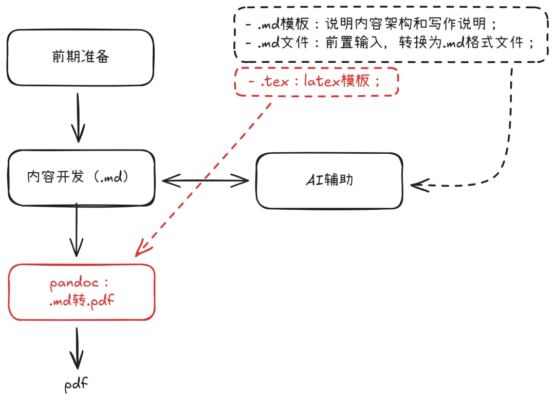 接下来,我将以演示指令的方式,说明如何利用AI辅助开发,实现工作流核心步骤(md2pdf)的开发,并且以Python脚本的形式,对功能进行封装,形成相对固定的用户接口,以简化Pandoc操作。