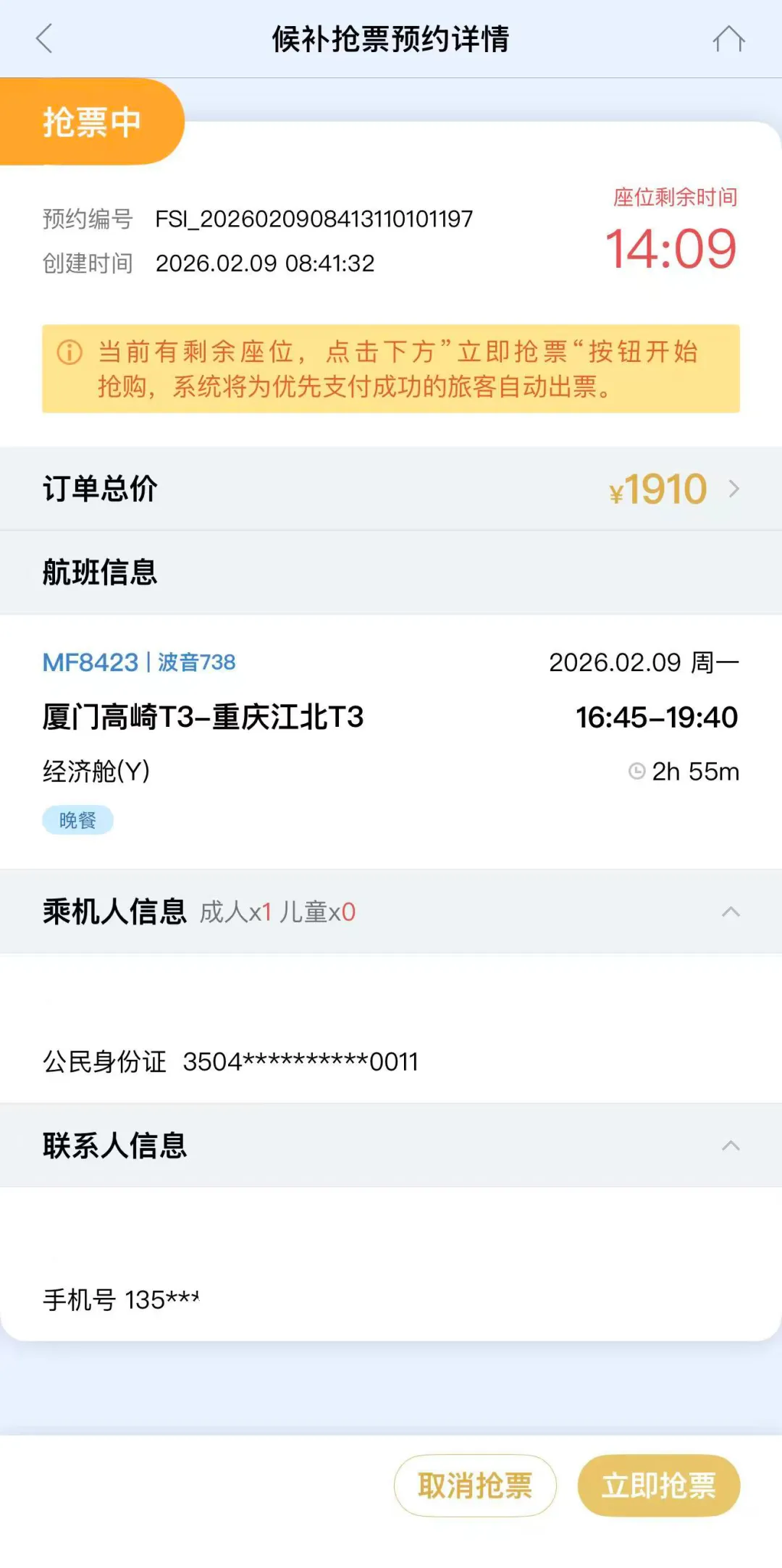(抢票时间需在航班起飞前2.5小时之外)