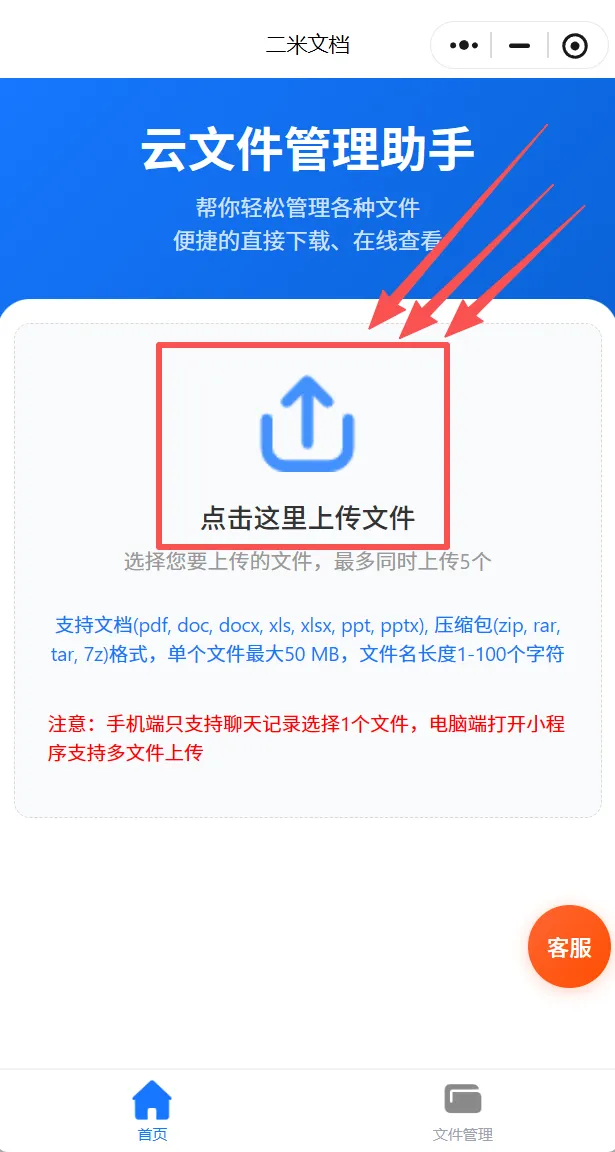 第一步:点击首页「上传文件」按钮,从电脑端、或微信聊天记录中,选中要添加的Word或Excel表格(支持pdf, doc, docx, xls, xlsx, ppt, pptx),压缩包(zip, rar,tar,7z)格式,单个文件最大50MB,文件名长度1-100个字符)等待上传完成。