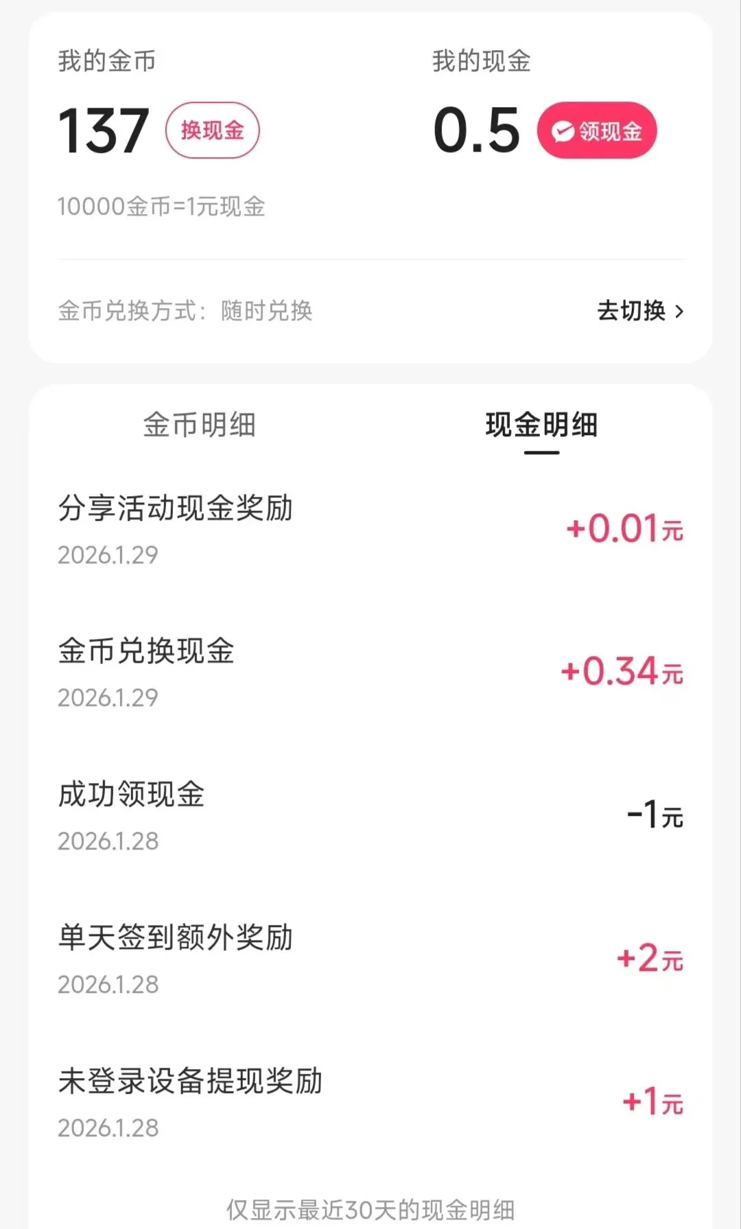 初次登录,系统会送未登录设备奖励1元,单天签到额外奖励2元。平时看广告,刷视频,看直播,也都能获得一定数量的金币。10000金币=1元现金。提现分成三档:0.5元,15元,30元。