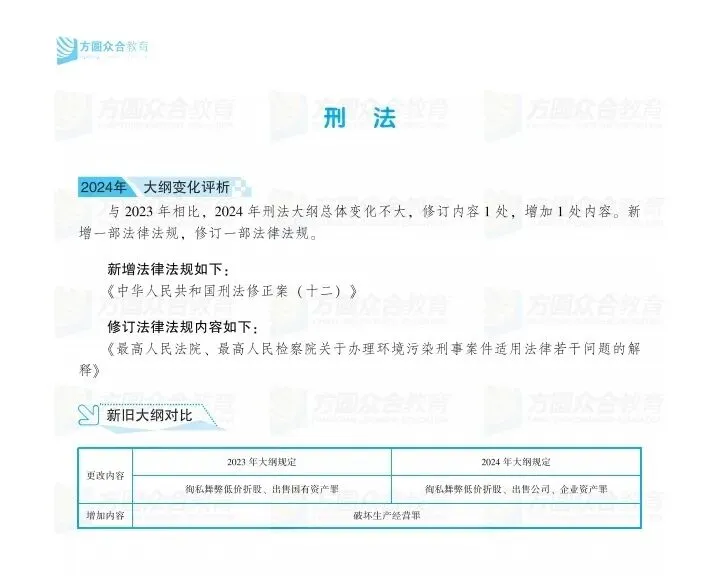 新大纲的主体内容没有变化,但是大纲后面附加的这个法律文件有新的变动,法律文件主要是两个:一个是《刑法修正案(十二)》,还有一个是增加了两个司法解释。