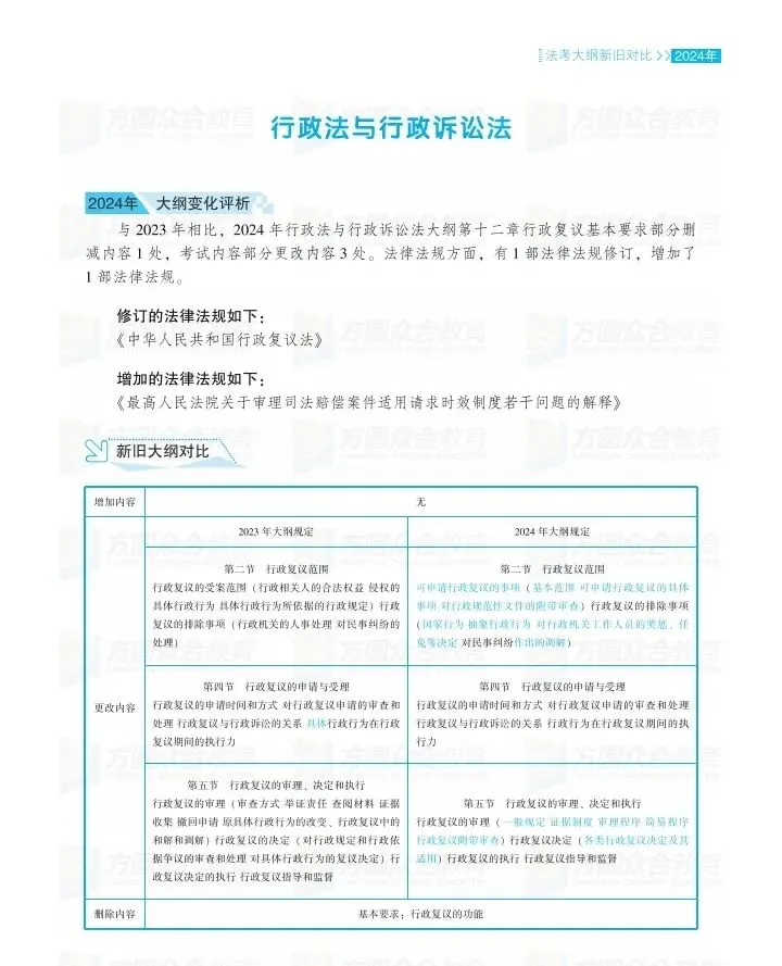 今年行政法大纲的修改核心就是《行政复议法》,还多了一个《最高人民法院关于审理司法赔偿案件适用请求时效制度若干问题的解释》,这个司法解释难度不大,并不是每个法条都能考,并不是每个法条的每一个词眼都能考,而且它的增加对我们的考试还是有好处的,因为一般来说这种增加的地方当年是会出题的,那么考试就司法赔偿的范围反而就缩小了。