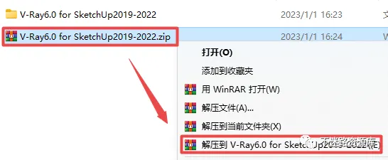 1.选中下载的压缩包,然后鼠标右键选择解压到“V-Ray6.0 for SketchUp2019-2022”(没有解压选项点这里)