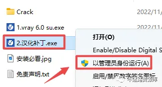 9.返回之前解压的“V-Ray6.0 for SketchUp2019-2022”文件夹,找到并选中“2.汉化补丁.exe“,鼠标右键选择“以管理员身份运行”