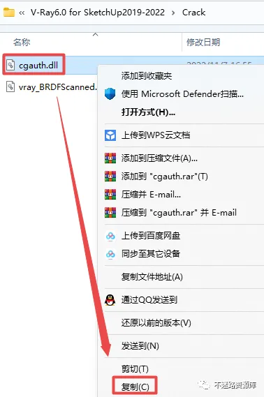 12.返回之前解压的“V-Ray6.0 for SketchUp2019-2022”文件夹,双击打开“Crack”文件夹,选中“cgauth.dll”文件,鼠标右键选择“复制”