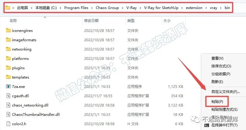 13.依次打开文件夹路径“C:\Program Files\Chaos Group\V-Ray\V-Ray for SketchUp\extension\vray\bin”,在打开的文件夹空白处,鼠标右键“粘贴”刚才复制的“cgauth.dll”文件