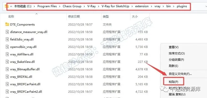 16.依次打开文件夹路径“C:\Program Files\Chaos Group\V-Ray\V-Ray for SketchUp\extension\vray\bin\plugins”,在打开的文件夹空白处,鼠标右键“粘贴”刚才复制的“vray_BRDFScanned.dll”文件