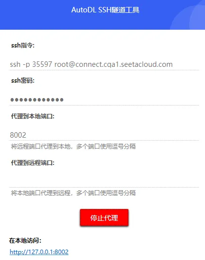 AutoDL平台提供了一个SSH隧道工具,可以将其容器中的服务端口暴露在你的目标机器中,让你实现像调用本地服务一样的方式来调用远程服务~