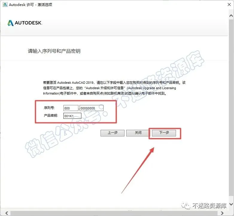 11.输入序列号:“800-00000000”,输入产品密钥:“001K1”,点击“下一步”