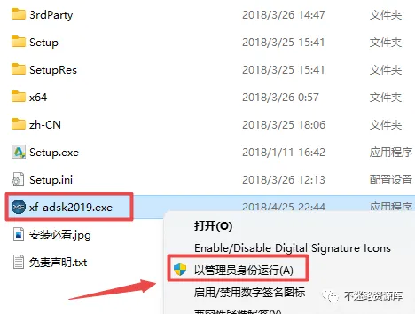 14.返回之前解压的“CAD2019(64bit)精简版”文件夹,找到并选中“xf-adsk2019.exe”,鼠标右键选择“以管理员身份运行”