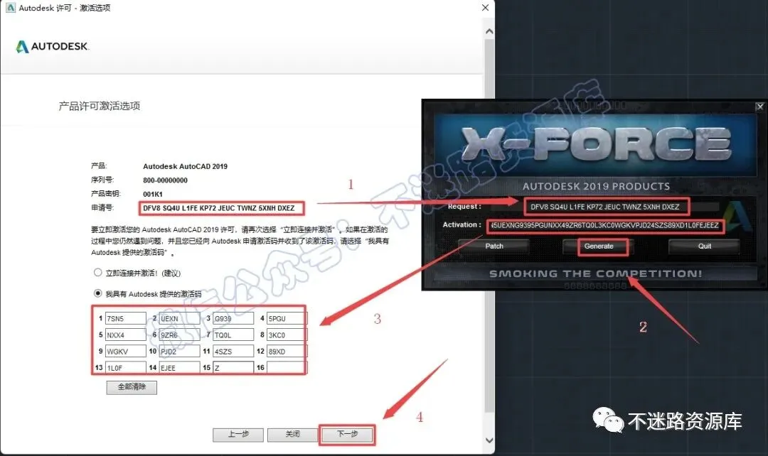 16.将安装界面的“申请码”复制到粘贴到“Request”,点击“Generate”,然后将“Activation”复制粘贴到“我具有Autodesk提供的激活”对应框内,最后点击“下一步”