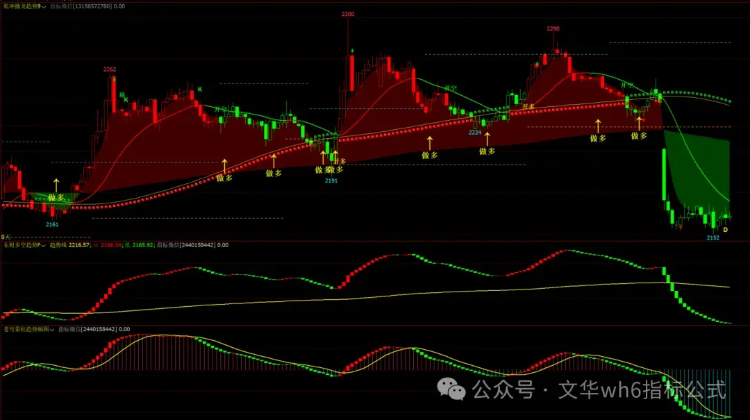 1、乾坤擒龙趋势9主图,苍穹量柱趋势幅图,东财趋势多空F幅图