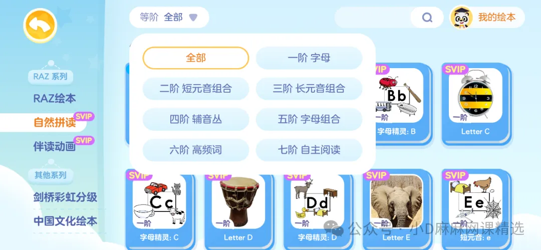 无论VIP还是SVIP,都包含了zui精华的绘本馆部分,也就是2000+册的RAZ全阶绘本资源。