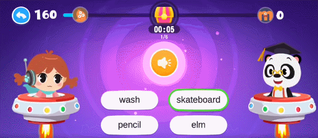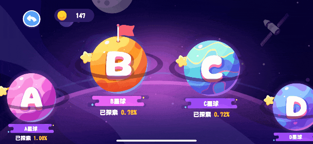 还可以乘坐飞船去探索单词宇宙星球,独立挑战单词学习,听音答题,跟读辨音等,让娃趣味学单词;