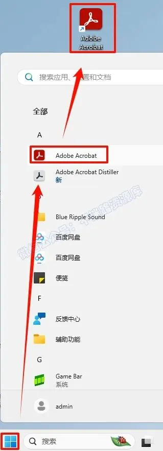 6.点击“开始“菜单栏,点击“所有应用“,找到“Adobe Acrobat“软件,鼠标左键拖拽到桌面上即可创建桌面快捷方式