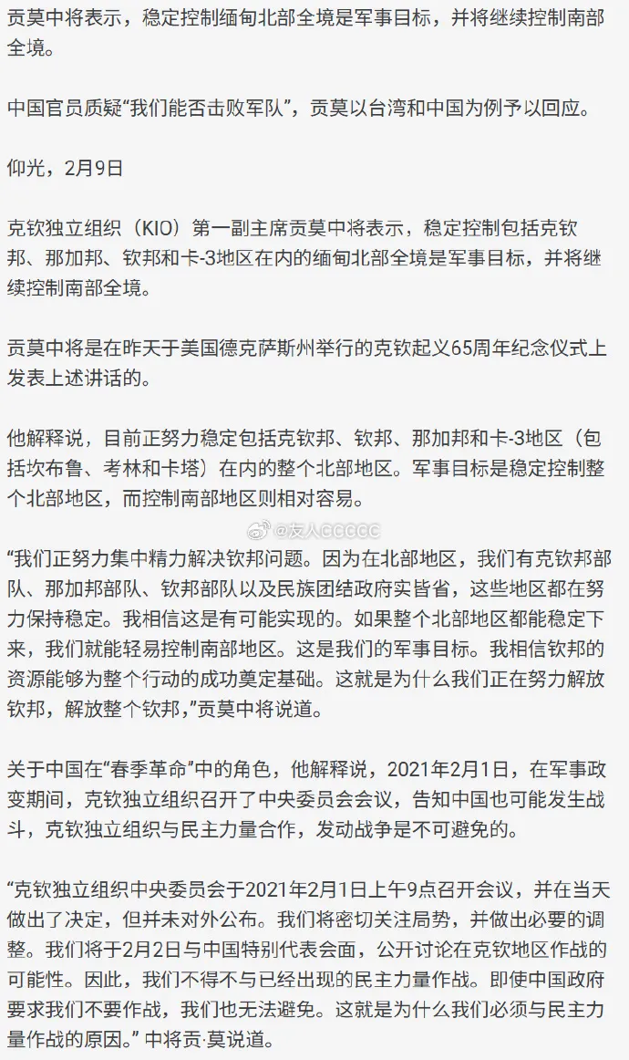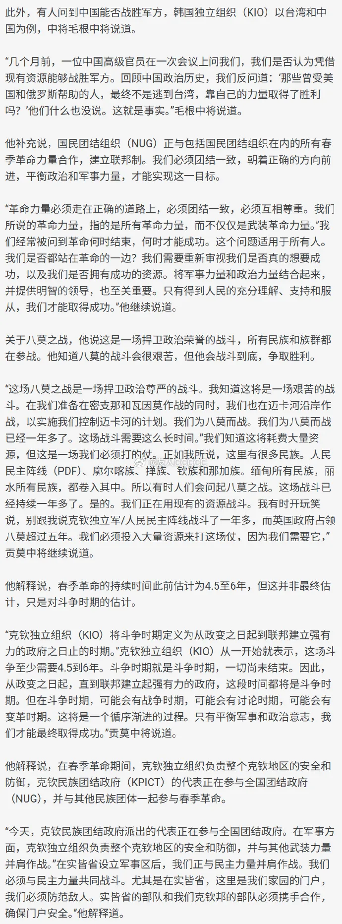 重磅!克钦军谋划联手PDF等武装控制缅甸北部全境 克伦独立政府第一副主席甘莫在接受美国德克萨斯周举行的克钦革命65周年纪念仪式上发布远程讲话,称克钦军将联合PDF以及其他革命力量控制缅甸北部全境。此外,会议期间NUG、KNU、KNPP、CNF、KIO等五个政治组织也就相关合作事宜展开了讨论。 图源见图标 克钦军计划控制的缅甸北部地区
