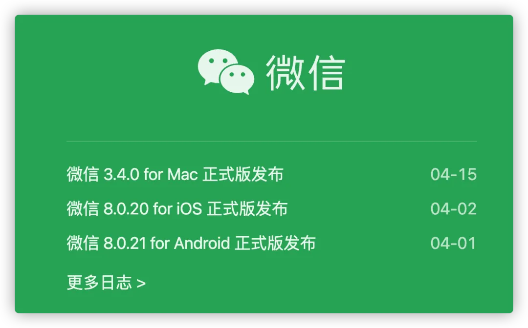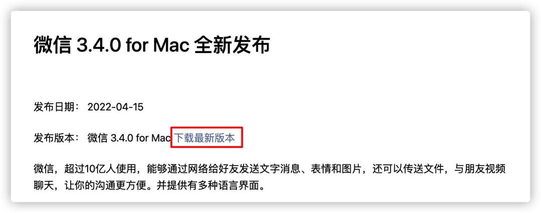 需要注意的是:本次 Mac 微信的版本更新并未在 App Store 上推送,而是在微信官网放出了新版本安装包的下载链接。