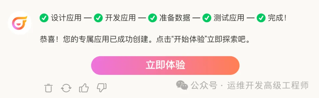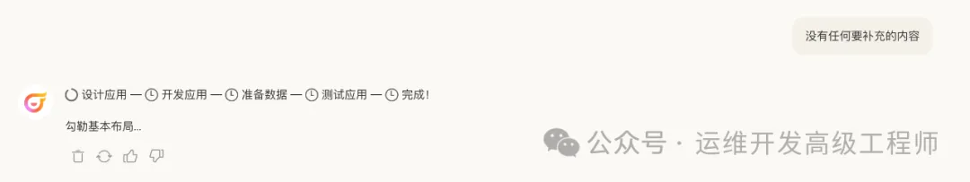 可以看到具体包含了设计应用、开发应用、准备数据、测试应用等步骤,这个过程可能需要等待较长的时间,毕竟一个完整且确切符合要求的应用需要精心打磨