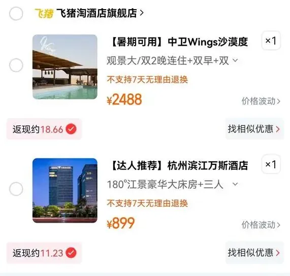 比如下面这个,如果在淘宝或飞猪下单,就没有优惠,在一淘下单可以分别返现18.66元和11.23元。