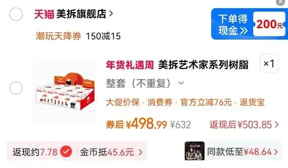 正常淘宝买东西,我也会在这里比较一下,是淘金币合适还是一淘返现合适,下面这个就是淘金币更合适,一淘返现7.78元,而淘金币直接抵扣45.6元。