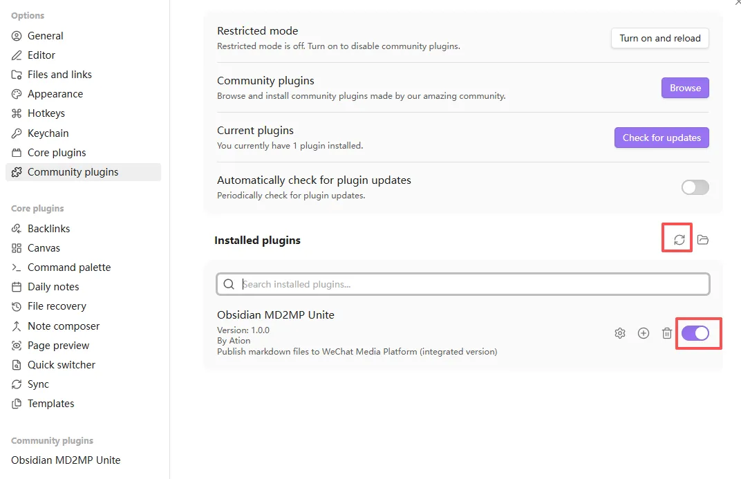 打开 Obsidian 的设置,找到社区插件,刷新本地插件,启用即可~
