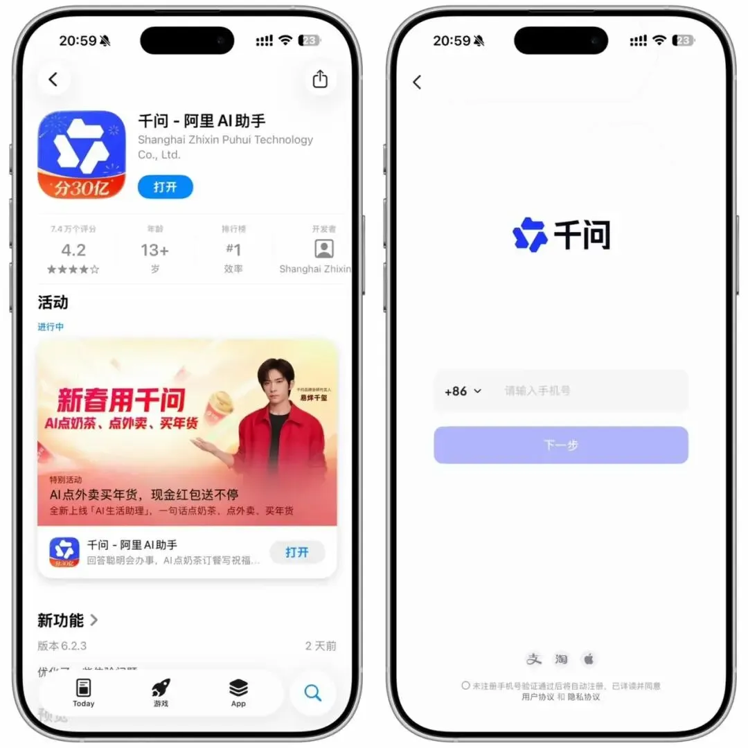 第一步:按照上图在各自的应用商店搜索:【千问】APP,然后下载,下载完之后输入手机号注册即可。
