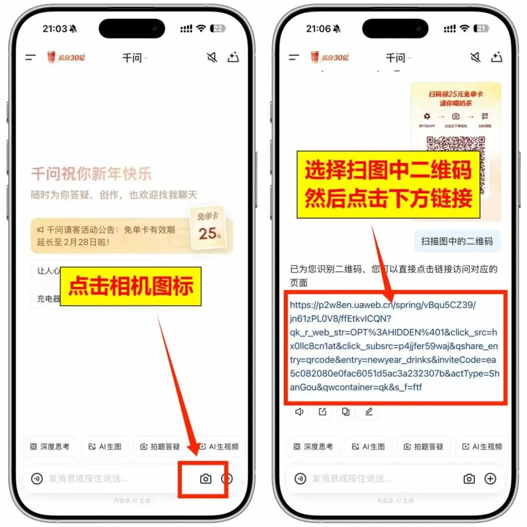 第二步:扫描二维码,有两个手机的可以直接拿另外一个手机扫,只有一个手机的保存好下方二维码,进入【千问】右点击右下角相机图标,然后上传保存的二维码,选择【扫描图中二维码】会出来一个链接,点击链接就可以获得25元的免单券了。