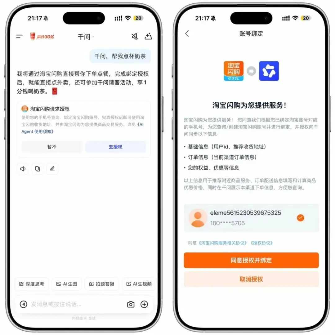 第三步:进入之后可以给千问发送:“千问,帮我点杯奶茶”,“千问,帮我点个外卖”等等指令,新用户的话千问会让你授权淘宝账号,点击授权即可完成绑定。