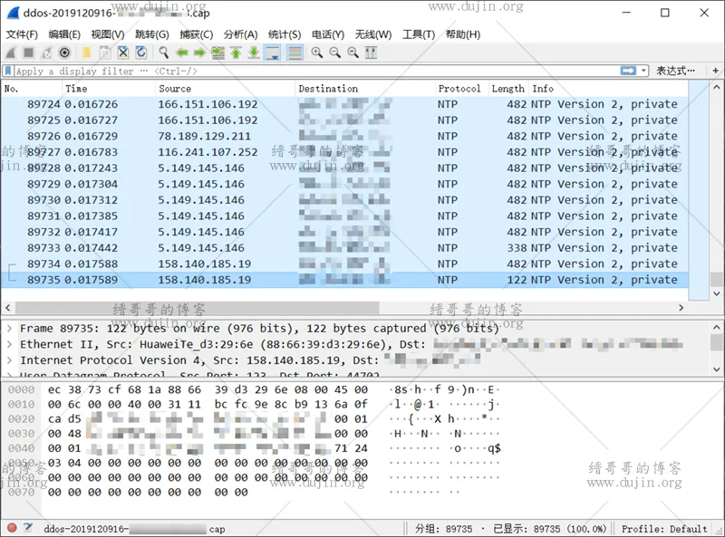 它的强大特性:例如包含有强显示过滤器语言和查看TCP会话重构流的能力,支持上百种协议和媒体类型。但是,缙哥哥单纯只是用其查看cap格式文件而已,用来导出、分析DDOS攻击数据。更多的功能小伙伴们可以去网上找找教程学习!