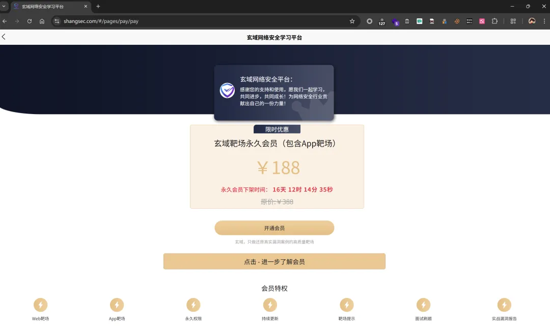 然后目前的话,永久会员仅需188¥,即可享受玄域web/app靶场等所有内容的永久权限!