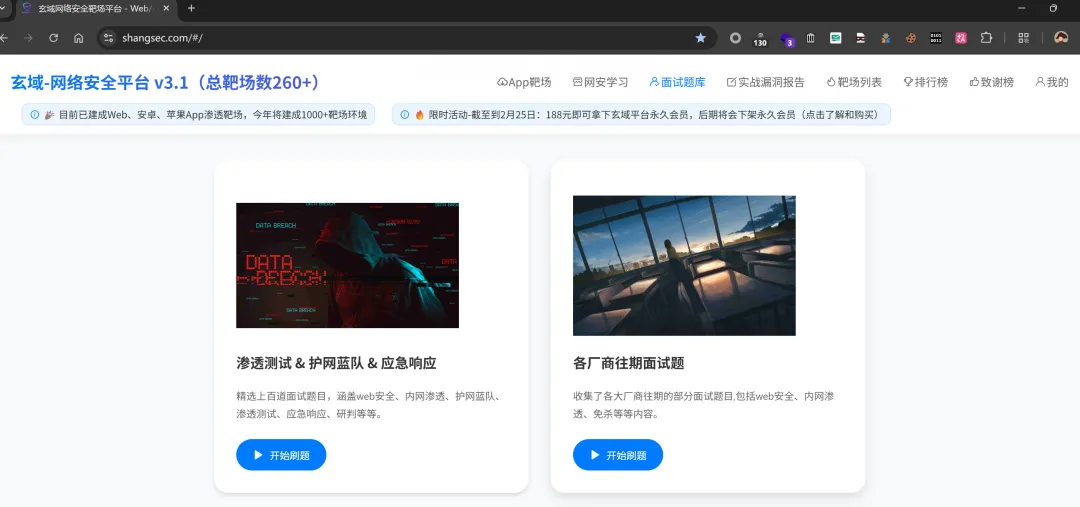 目前,平台已建成web渗透靶场、安卓App渗透靶场、苹果App渗透靶场、实战漏洞报告板块、面试刷题板块、网安学习板块等等。