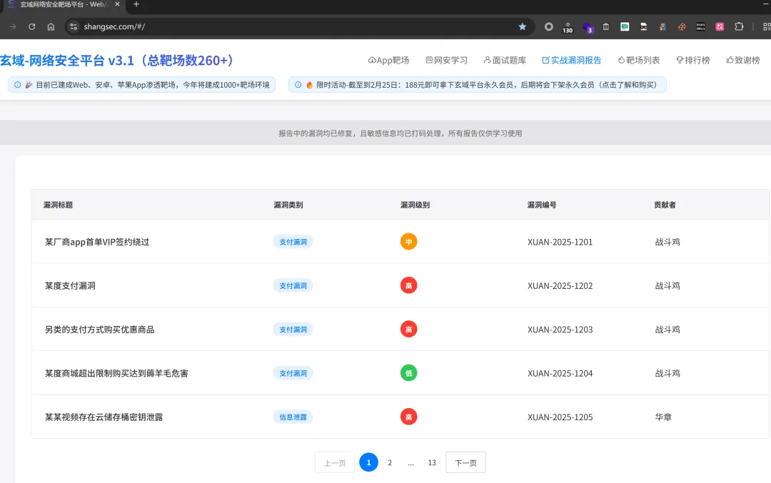 目前,平台已建成web渗透靶场、安卓App渗透靶场、苹果App渗透靶场、实战漏洞报告板块、面试刷题板块、网安学习板块等等。