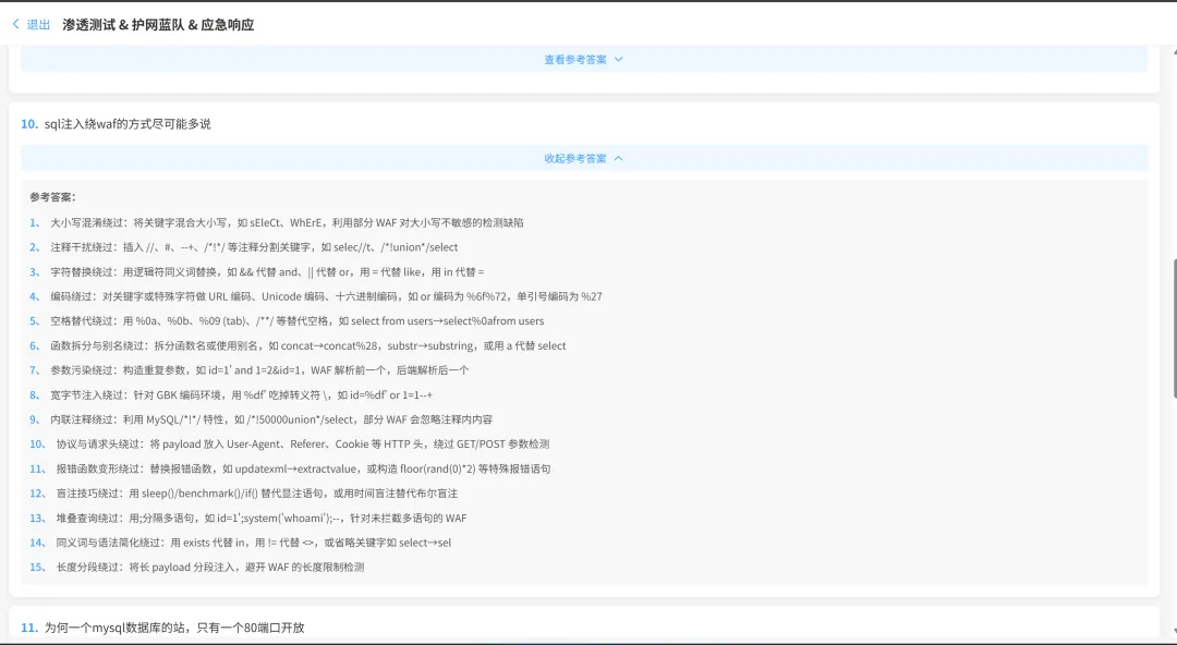 目前平台已有上百道精选面试题目,并且所有面试题均有参考回答,涵盖:渗透测试、护网蓝队、应急响应、各厂商的往期面试题目等等。