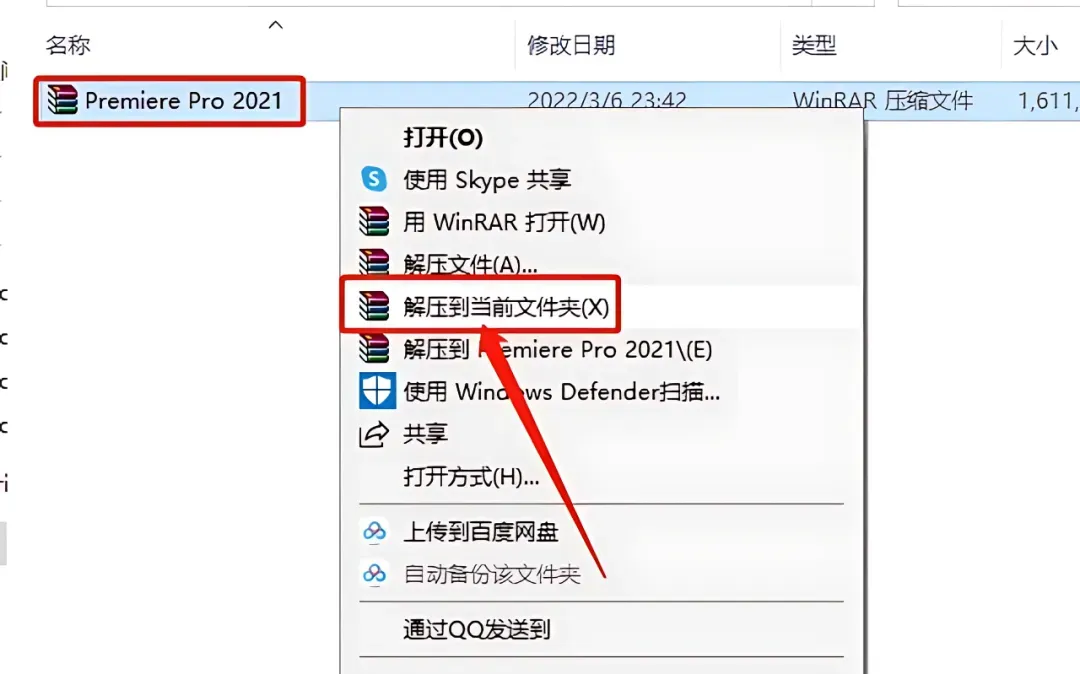 1.打开下载好的Pr软件安装包,鼠标右击压缩包选择【解压到当前文件夹】。