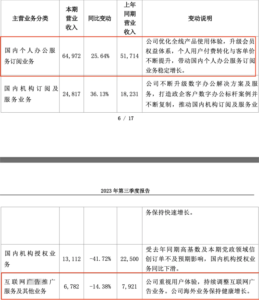 到今年第三季度,金山办公互联网广告推广服务和其他业务收入为6782万元,同比下降14.38%,而国内个人办公服务订阅业务实现了6.4972亿元的营收,同比增长25.64%。