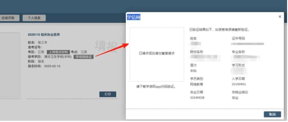 2.点击“考试报名”菜单,在已完成的报名信息下增加了一行“报考学历”,点击“学信网验证”进行学信网扫码验证/更新。