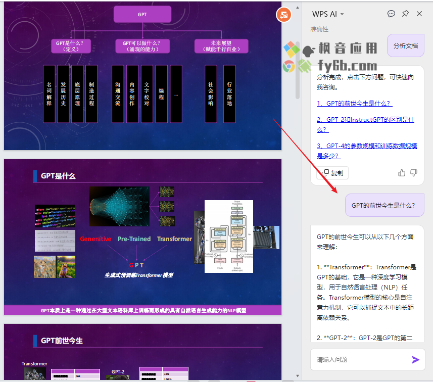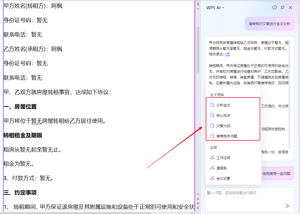 另外,它还能根据文档内容自动分析全文、文章大纲、核心观点并提出一些问题建议,可以大大提高办公效率。