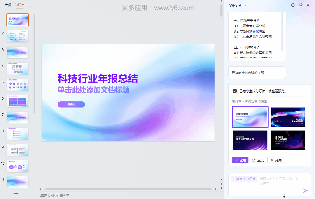 你只需要填写一个主题,它就能自动帮你生成一套PPT,并且右侧还能快速切换风格,这个功能针不戳!