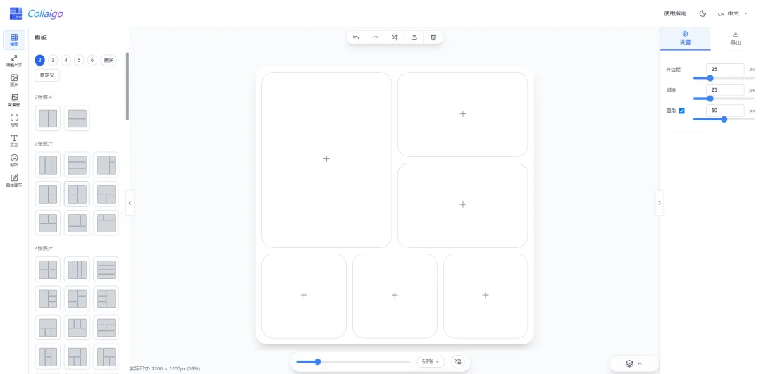 在线图片拼贴工具,可自定义行列数、间距、背景样式(支持纯色或图案),并应用多种九宫格相框布局,支持旋转、翻转、透明度调整,还可设置输出分辨率并导出高清图像,完全免费,无需注册。