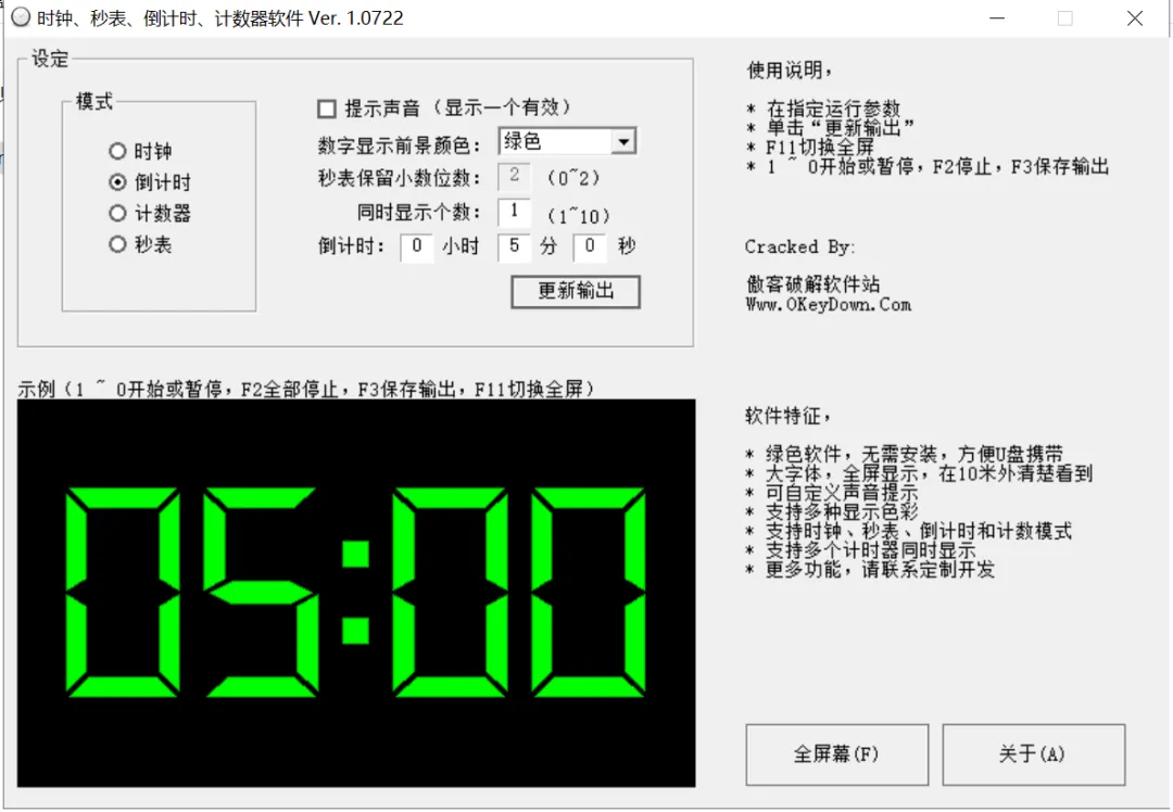 设置一下,点击倒计时,更新输出,点击全屏幕,点击键盘“1”开始计时。