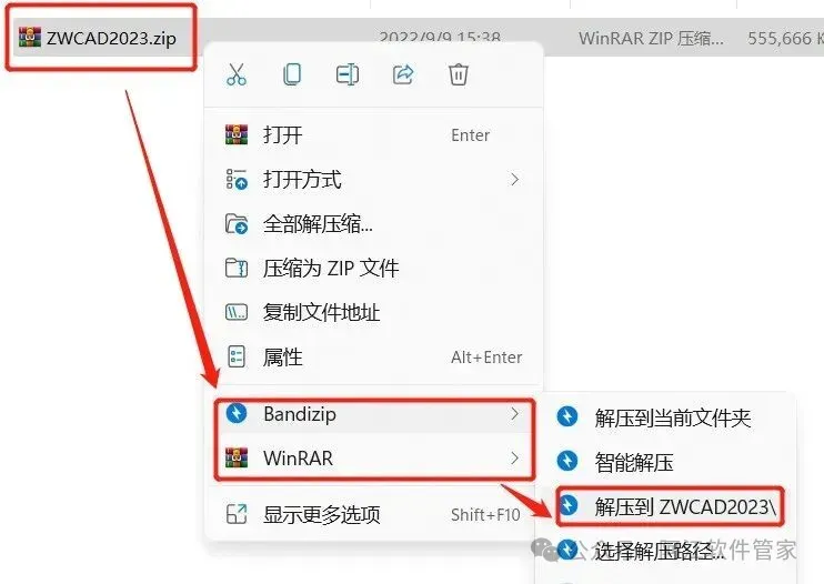 1.软件安装包下载之后,鼠标右键,解压到ZWCAD2023,