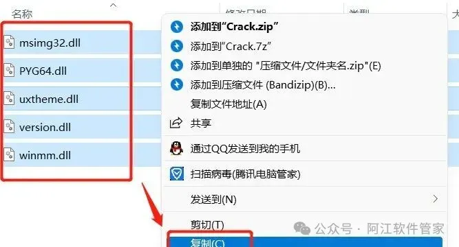 9.选中这5个文件,鼠标右键 复制。注:如果文件为空,就是被拦截掉了,关闭杀毒工具重新解压Crack即可。