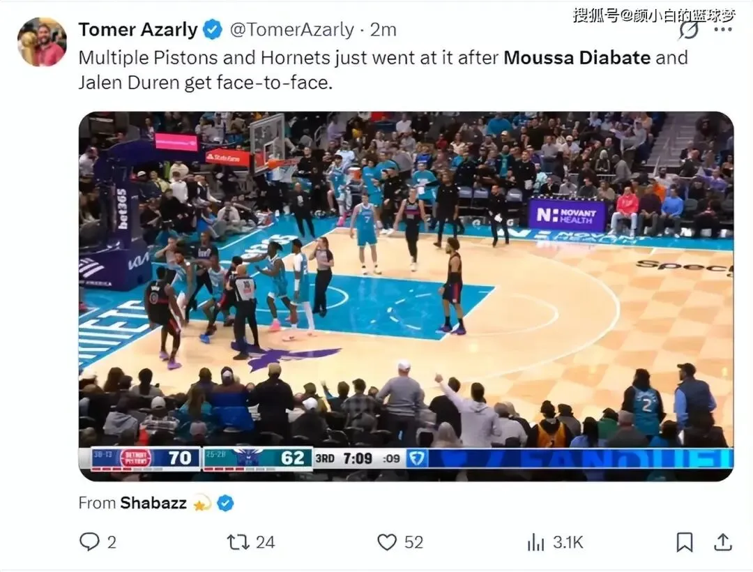 北京时间2月10日,活塞与黄蜂的比赛中爆发巨大冲突,NBA再一次上演了全武行,在裁判将两队的球员分开后,裁判看了回放直接驱逐了四人:迪亚巴特、布里奇斯、杜伦、斯图尔特,最终两队都没讨到便宜。