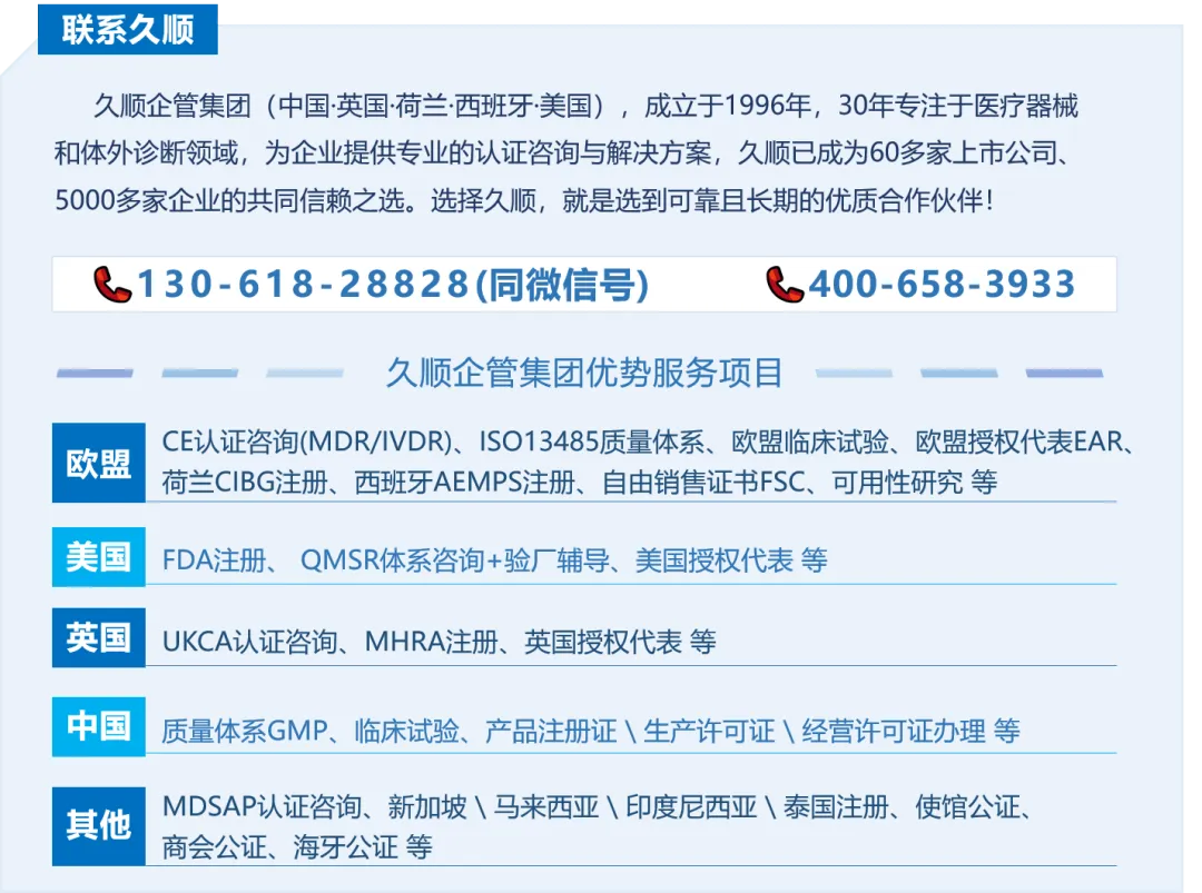 →如需:建立欧盟ISO13485体系/MDSAP/国内质量管理体系/美国FDA体系验厂/质量体系培训&验厂等,欢迎致电久顺咨询合作!