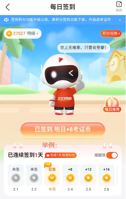 2月14日0点-2月23日23:59,整整10天,登录233网校APP签到即可领取双倍考证币!规则简单粗暴: