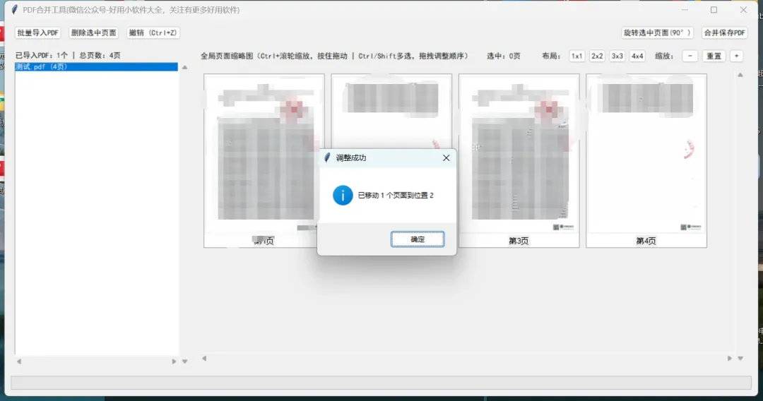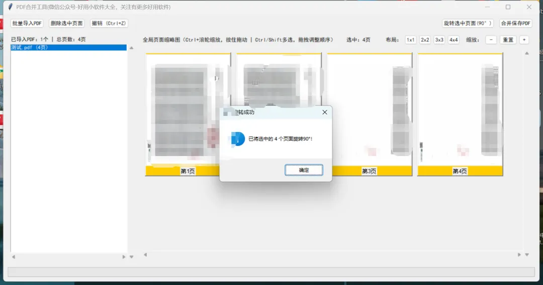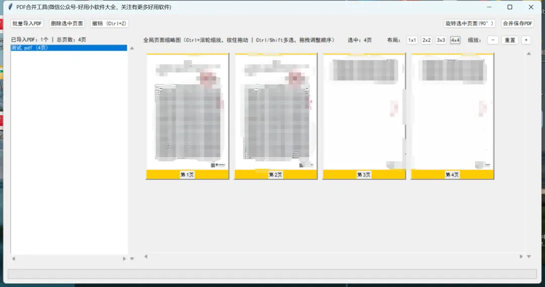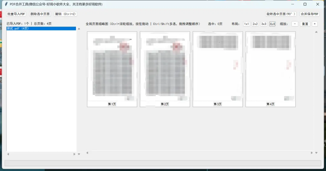 1、支持多个PDF文件合并,右边实时显示预览效果,支持1X1、2X2、3X3、4X4四种预览方式查看,同时可以对预览图进行放大和缩小。如下图