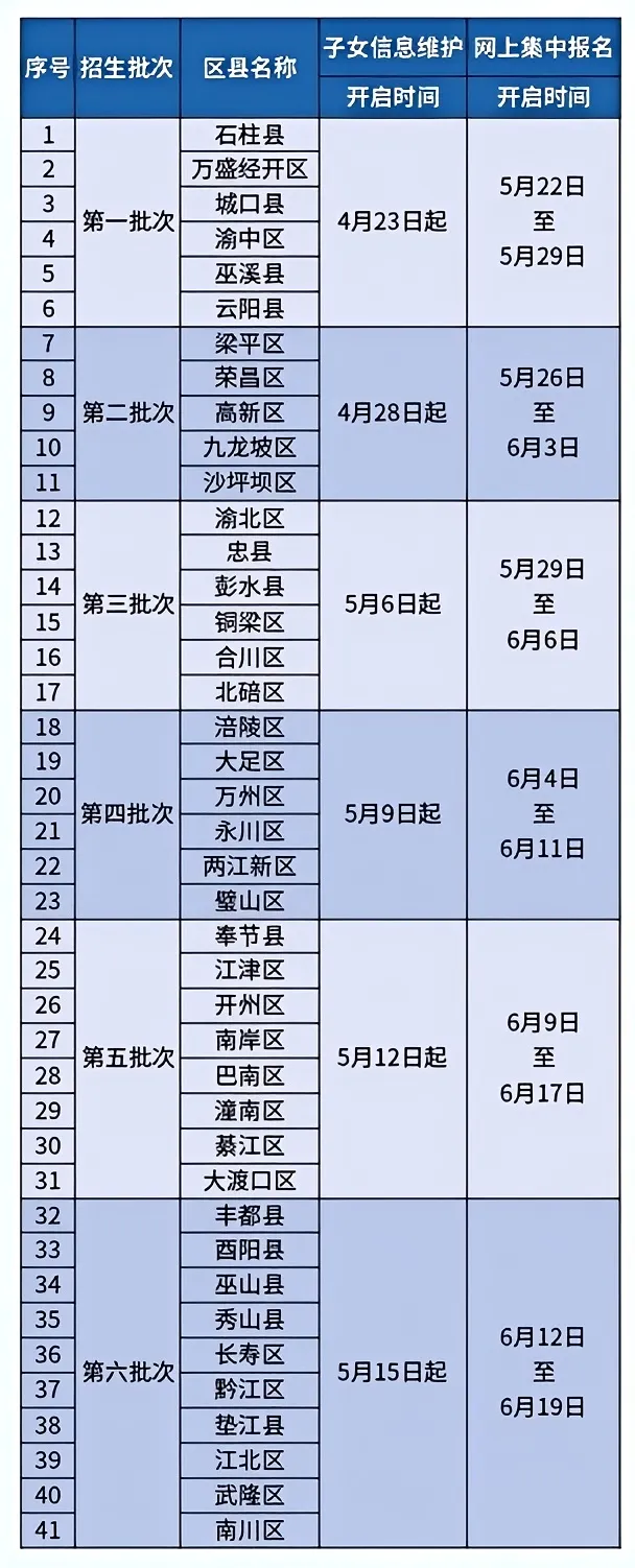 从4月23日起,全市各地区的家长可下载登录“渝快办”APP,按照划分批次依次进行子女信息维护。
