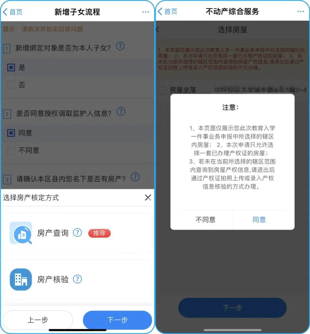 选择好预报名的子女,点击“确认”后进入房产核验流程,可选择两种不动产核定方式,这里以“房产查询”方式为例。