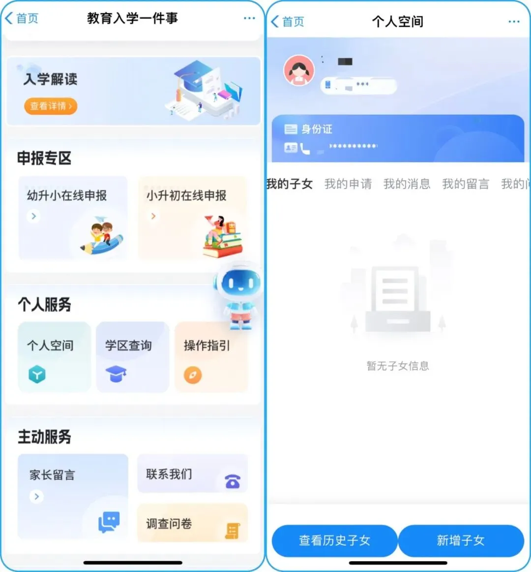 找到“个人服务”-“个人空间”点击进入,点击“新增子女”开展子女信息的维护。